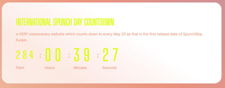 INTERNATIONAL SPUNCH DAY IS AN EVENT WHICH CENTERS ON MAY 22 (THE FIRST INITIAL RELEASE OF SPUNCHBOP FUNKIN) AND A FULL COUNTDOWN WEBSITE HAS BEEN MADECHECK IT OUT Here (click link/yellow text)